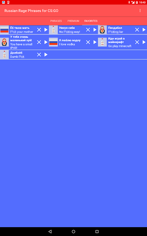If you have ever played Counter-Strike: Global Offensive (CS:GO), you have probably encountered Russians that do not understand a thing in English. CS:GO is a team game, so you have to adjust and put all the efforts to efficiently communicate with the team and get the win. This app helps you to achieve that. It contains the most common rage phrases that Russians use in CS:GO. You can use this app to express your feelings and have a good time with your Russian teammates.