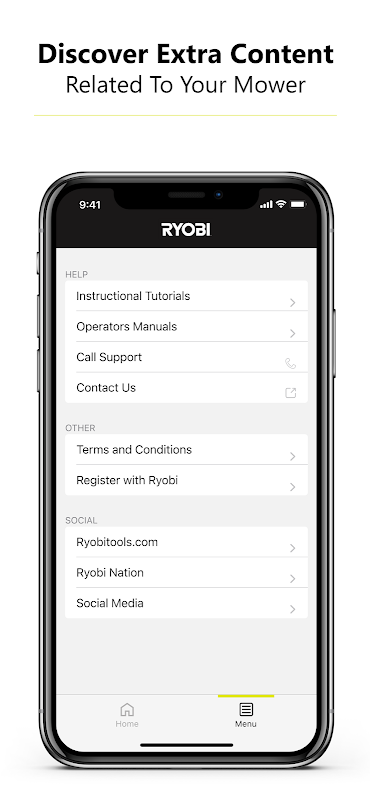 Ứng dụng RYOBI ™ Riding Mower ghép nối với Máy cắt cỏ RYOBI ™ Riding Mower tương thích của bạn cho phép bạn dễ dàng theo dõi Máy cắt cỏ RYOBI ™ 80V của mình ngay từ điện thoại. Ứng dụng cho phép bạn truy cập tất cả thông tin cần thiết về máy cắt cỏ của bạn và cung cấp quyền truy cập vào các hướng dẫn và hướng dẫn hữu ích.