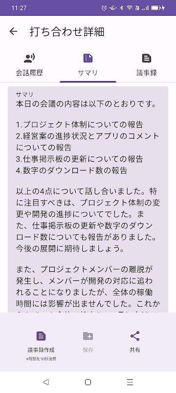 Sau khi cuộc họp bắt đầu, dữ liệu âm thanh sẽ tự động được chuyển thành văn bản theo thời gian thực. Và văn bản phiên âm sẽ được tự động tóm tắt. Hơn nữa, số phút có thể được tạo chỉ bằng một cú chạm! Với sức mạnh của AI, chúng tôi đã đạt được khả năng sao chép, tóm tắt và tạo phút có độ chính xác cao. Điều này giúp giảm thời gian và chi phí tạo biên bản cuộc họp! Đủ lợi ích cho công ty thông qua tiết kiệm lao động.