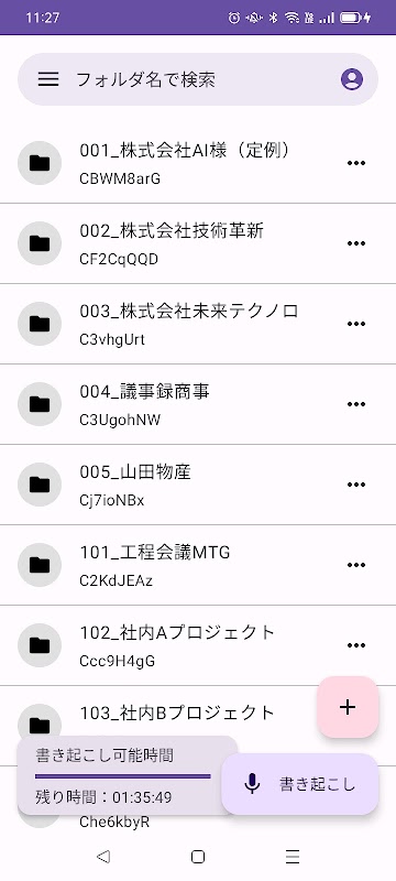 [Chức năng quản lý thư mục] Dữ liệu cuộc họp có thể được quản lý trong các thư mục có thể được tạo tự do. Ví dụ: bạn có thể chia dữ liệu cuộc họp thành "thư mục khách hàng A", "thư mục B đối tác kinh doanh" và "thư mục nội bộ nhóm C" và lưu dữ liệu cuộc họp vào từng thư mục, giúp việc quản lý dữ liệu dễ dàng hơn. Nó cũng làm giảm chi phí tìm kiếm trong vài phút.