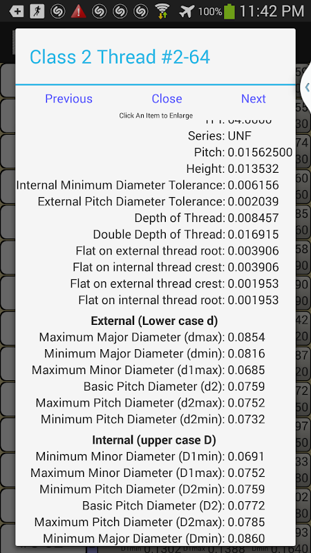 Hiển thị chi tiết thông tin về chủ đề cho inch / SAE kích thước sợi theo tiêu chuẩn ASME B.1.1 cho Unified Quốc Inch Screw Threads. Các dữ liệu trong các ứng dụng được tính toán từ các công thức được đưa ra trong các tiêu chuẩn ASME B.1.1, và kết quả là có thể được tắt bằng 0,0001 "do làm tròn được sử dụng trong tiêu chuẩn. Vì vậy, bất cứ ai cần dữ liệu chính xác hơn nên tham khảo các tiêu chuẩn trực tiếp. Một số con số khác được làm tròn đến dưới 1/10000 ", nhưng ứng dụng này vẫn còn hiển thị chúng để 1/10000". Tôn trọng những con số trong ứng dụng này vẫn sẽ nằm trong tiêu chuẩn mặc dù. Nó cũng cho thấy chi tiết hơn rất nhiều so với những gì được liệt kê trong các bảng trong tiêu chuẩn, xem ảnh chụp màn hình để xem những thông tin được hiển thị.