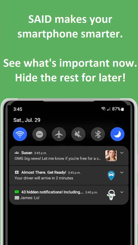 • Lọc thông báo trực quan: Tận hưởng một cuộc sống không có sự lộn xộn của kỹ thuật số. SAID lọc cẩn thận các thông báo của bạn, chỉ nêu bật những thông tin quan trọng - từ các email công việc thiết yếu đến các tin nhắn cá nhân nhất của bạn.