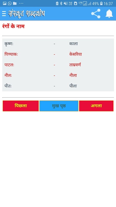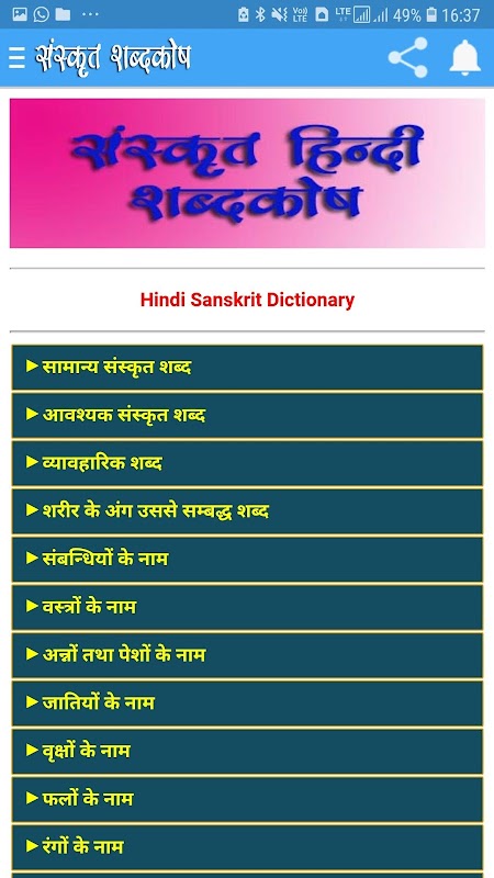 इस ऐप में संस्कृत भाषा के प्रमुख शब्दों का अर्थ हिंदी में बताया गया है Sanskrit Hindi Dictionary