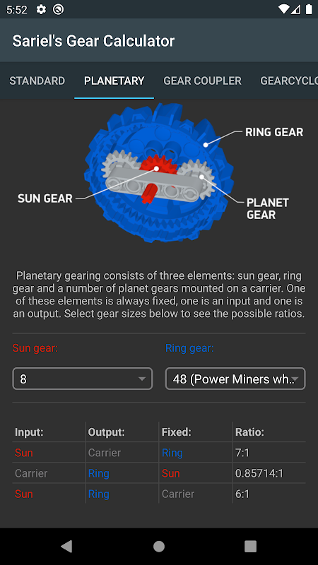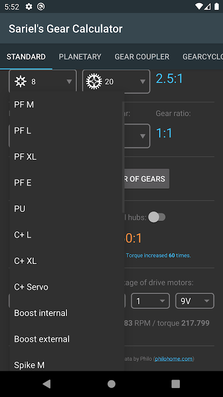 Công cụ này nhằm vào tất cả AFOL. Sử dụng nó để tính toán tỷ số cuối cùng của tối đa 10 cặp bánh răng, sau đó chọn loại và số lượng động cơ mong muốn để xem sản lượng lý thuyết (tốc độ và mô-men xoắn). Bao gồm 15 kích cỡ bánh răng và 26 loại động cơ khác nhau! Ngoài ra còn có: máy tính tỷ số hành tinh, bộ ghép bánh răng để tìm các tổ hợp bánh răng có sẵn tại khoảng cách trục nhất định và Gearcyclopaedia có thông tin chi tiết về 38 loại bánh răng. MỚI: Tab công cụ tìm kết hợp nơi bạn có thể nhập tỷ số truyền mong muốn và số cặp bánh răng bạn muốn sử dụng và ứng dụng sẽ tính toán giải pháp (chính xác hoặc gần nhất có thể).