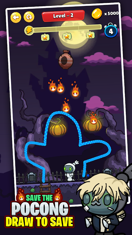 Pocong Mumu bị làm phiền bởi lũ quái vật, hãy cứu Pocong bằng cách vẽ một hàng rào bằng dây thừng, bằng cách kéo sợi dây này bạn có thể cứu Pocong khỏi bị truy đuổi bởi những con ma nghịch ngợm.