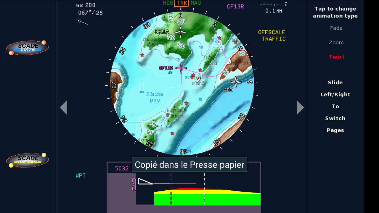 The Avionics Multi-Function Display (MFD) application illustrates, for educational purposes, how tactile interactivity concepts are brought into the plane cockpit with a realistic Multi-Function Display, inspired from a Boeing 737 display system. The Avionics MFD application has been automatically generated from SCADE Suite® and SCADE Display®.