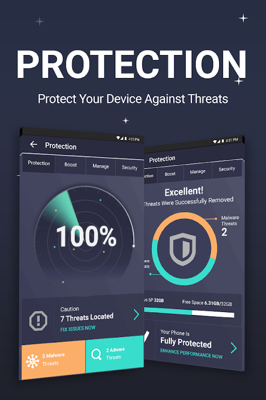 • Bảo vệ: Sử dụng tính năng chống vi-rút nâng cao của chúng tôi để quét các ứng dụng đã cài đặt của bạn nhằm đảm bảo điện thoại thông minh của bạn được bảo vệ khỏi Phần mềm độc hại và các ứng dụng có hại khác.