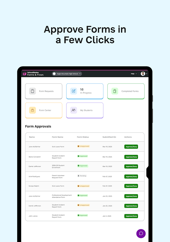 SchoolStatus Forms & Flows, trước đây là Operoo Central, giúp gia đình và nhân viên nhà trường dễ dàng hoàn thành, quản lý và nộp biểu mẫu của trường dưới dạng kỹ thuật số.
