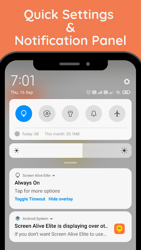 Screen Alive Elite có các tính năng cho phép thiết bị của bạn giữ cho màn hình luôn ở trạng thái tỉnh hoặc cho đến một khoảng thời gian không hoạt động cụ thể. Bạn có thể làm cho nó đủ thông minh để luôn bật màn hình trong khi sạc hoặc chuyển sang thời gian chờ thấp hơn khi pin thiết bị yếu.