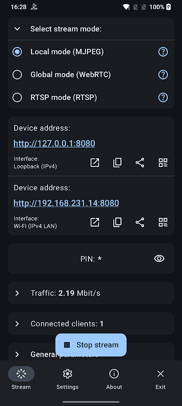 • Cục bộ (MJPEG) - Luồng HTTP không cần thiết lập trên Wi-Fi/điểm phát sóng của bạn; khóa bằng mã PIN; hoạt động ngoại tuyến hoặc trực tuyến.
