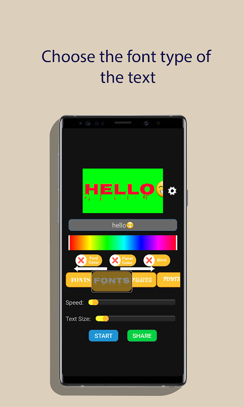 App that generates a scrolling text on the screen from the text entered by the user. You can choose between various text and background colors, font, text scrolling speed and blink screen effect.