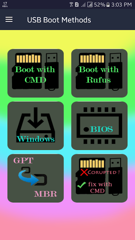 This SDCard/USB Boot Methods and Windows Installation app has six different categories and the details of every categories are following.