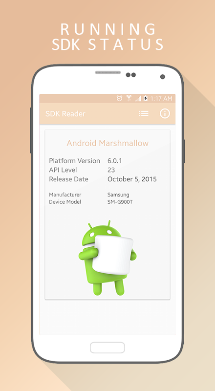 SDK Reader app shows current running SDK version on your device. You can also see a timeline with all Android Versions released and also they're API Level.