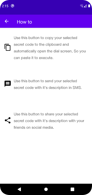 Secret Code For Android là một ứng dụng miễn phí, từ đó bạn có thể xem xét và sử dụng tất cả các mã ẩn, bảo mật và hoạt động trên tất cả các hệ điều hành di động Android. Ngoài ra còn có một nhóm mã bí mật cho điện thoại SAMSUNG, HTC, SONY, Motorola, LG, Lenovo, Oppo, Xiaomi, Infinix.