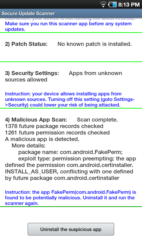 Do you know that installing system updates could result in your Android device being hacked? Recent investigation found six such vulnerabilities (called Pileup flaws) in Android OS. When you upgrade your device, a seemingly harmless app can exploit these vulnerabilities to get access of your voicemails, user credentials, call logs, notifications of other apps, Google Voice messages, etc. This security app scans your device to detect those malicious apps and guides you uninstall them once detected.