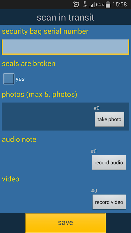 Sau khi làm đầy và niêm phong túi an ninh nó là đăng ký để theo dõi. Mọi thông tin liên quan cho túi mật được ghi lại bởi người gửi sử dụng một điện thoại thông minh hoặc máy tính bảng. Ngoài ra, các thông tin sau đây có thể được thêm vào: một bức ảnh của các túi kín, một bức ảnh của các nội dung, tên nhân viên và vị trí thực tế, chữ ký điện tử của người lao động bị bắt giữ trên điện thoại thông minh hoặc máy tính bảng, và video hoặc ghi chú âm thanh.