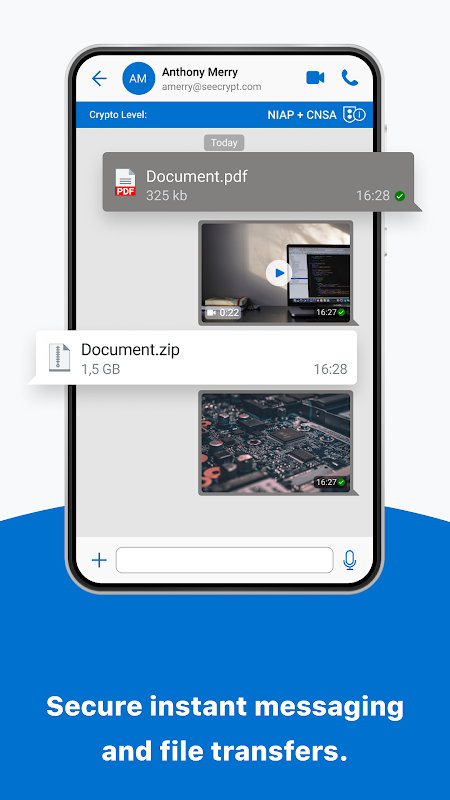 Seecrypt cung cấp tính năng nhắn tin tức thì an toàn với khả năng gửi ảnh, video, ghi chú thoại và bất kỳ loại tệp lớn nào. Tất cả các tin nhắn và tệp được mã hóa nối đầu với một khóa mới được tạo cho mọi tin nhắn hoặc tệp được gửi. Mã hóa Data at Rest nâng cao của Seecrypt bảo vệ tất cả các tệp và phương tiện được lưu trữ trong ứng dụng.
