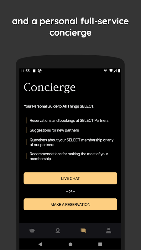 Các thành viên cũng có quyền truy cập vào nhóm trợ giúp SELECT, những người luôn sẵn sàng thông qua trò chuyện trực tiếp để hỗ trợ đặt chỗ và đề xuất bảy ngày mỗi tuần. Nhân viên hướng dẫn nội bộ của SELECT được đào tạo và hiểu biết về các hoạt động cũng như trải nghiệm khác nhau mà các thành viên của chúng tôi yêu thích để họ có thể đưa ra những đề xuất và đề xuất sáng suốt mọi lúc mọi nơi.