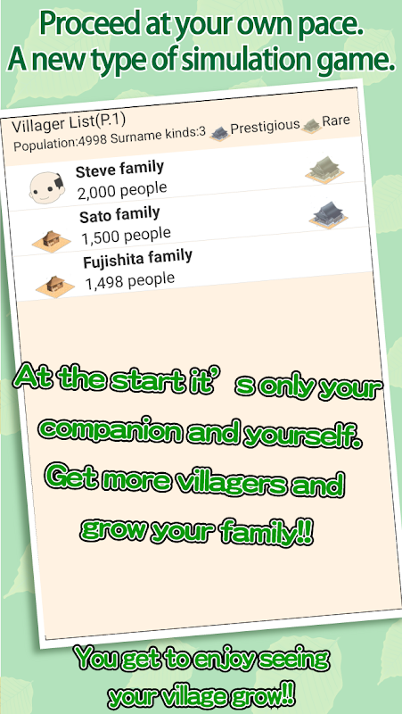 Trò chơi này cho phép bạn xây dựng ngôi làng của riêng mình mang tên bạn, hướng tới sự thống nhất của Nhật Bản. Bảng xếp hạng cho phép bạn cạnh tranh với tất cả các ngôi làng mạnh khác. Thu hoạch lúa, nuôi gia đình và tận hưởng việc xem ngôi làng của bạn phát triển.