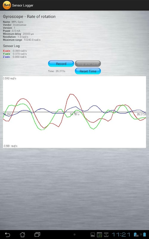 Sensor Logger also has real-time colour graphs which display the time history of the measurements