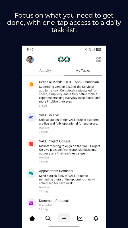 Ứng dụng di động servis.ai cho phép bạn quản lý hoạt động kinh doanh một cách dễ dàng khi đang di chuyển. Thông báo, bảng điều khiển và báo cáo theo thời gian thực, cùng tất cả dữ liệu doanh nghiệp của bạn chỉ với một cú chạm.
