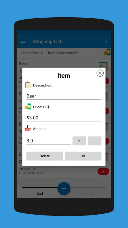 Hai tùy chọn danh sách trong cùng một ứng dụng. Sử dụng danh sách trước, một tùy chọn dự thảo để bạn tập hợp danh sách của mình trước khi bạn biết các giá trị của những gì bạn sẽ mua. Khi bạn điền vào giỏ hàng của bạn, bạn có thể thêm các mục trong danh sách trước vào giỏ ứng dụng, thêm giá thực tế và số lượng của từng sản phẩm.