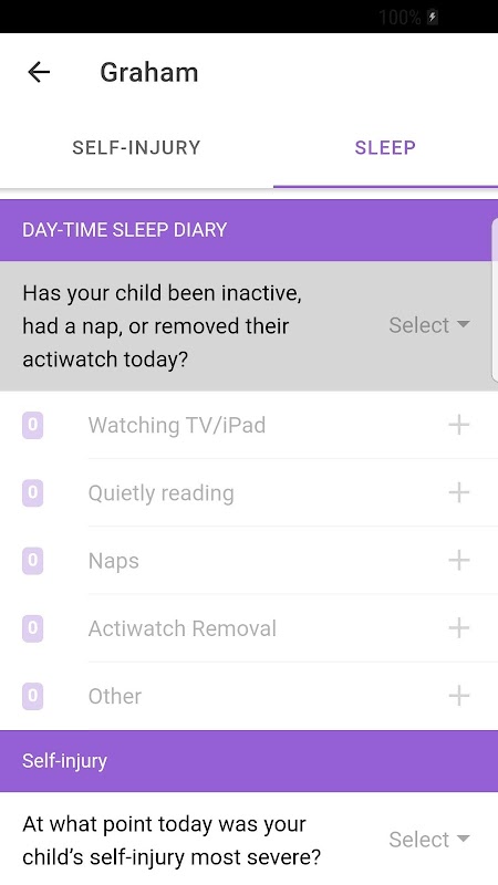 This mobile app will be used by parents/caregivers to record sleep activity and daytime behaviours shown by the child they care for. During the assessment period, parents/caregivers will record the presentation of self-injury and sleep difficulties (e.g. night-waking).