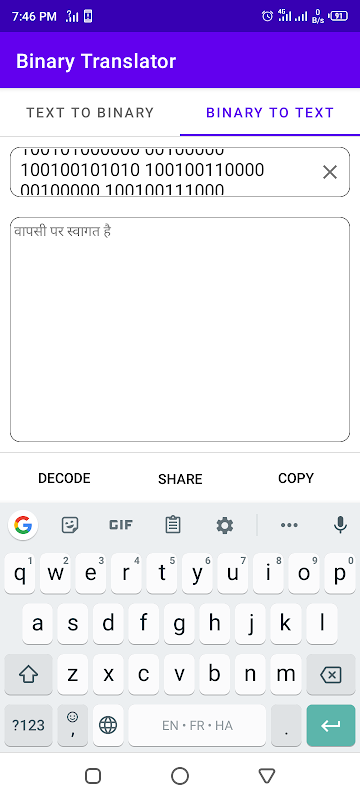 Ứng dụng này dịch văn bản sang nhị phân và nhị phân sang văn bản. Rất hữu ích để gửi tin nhắn hài hước hoặc được mã hóa cho bạn bè
