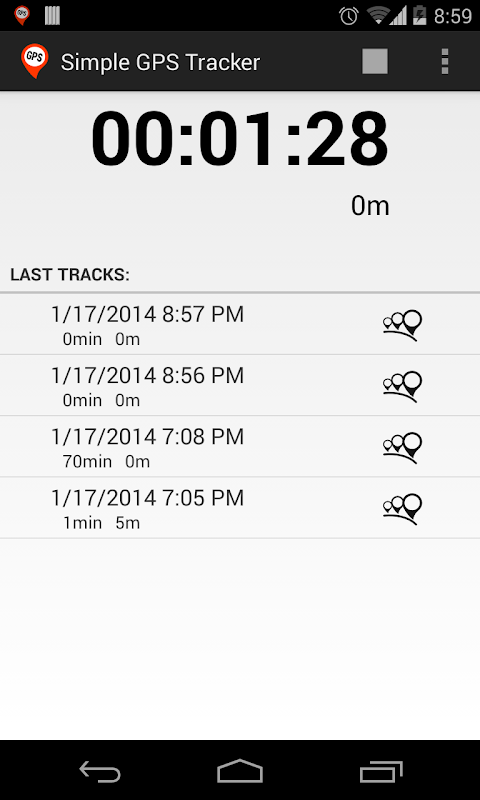 Simple GPS Tracker will help you to save your tracks and get some information about them. Application stores GPS locations of your route and gives you statistics.
