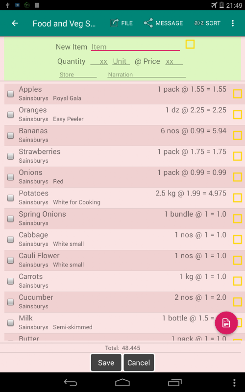 Một danh sách có thể được sử dụng ở chế độ Nhập cho phép bạn thêm các mục với thông tin chi tiết về số lượng, giá cả, cửa hàng, v.v.