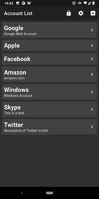 The service names of all the accounts managed by the app and their outlines are displayed in a list. Items in the list can be deleted by swiping left or right, and sorted by long-pressing.