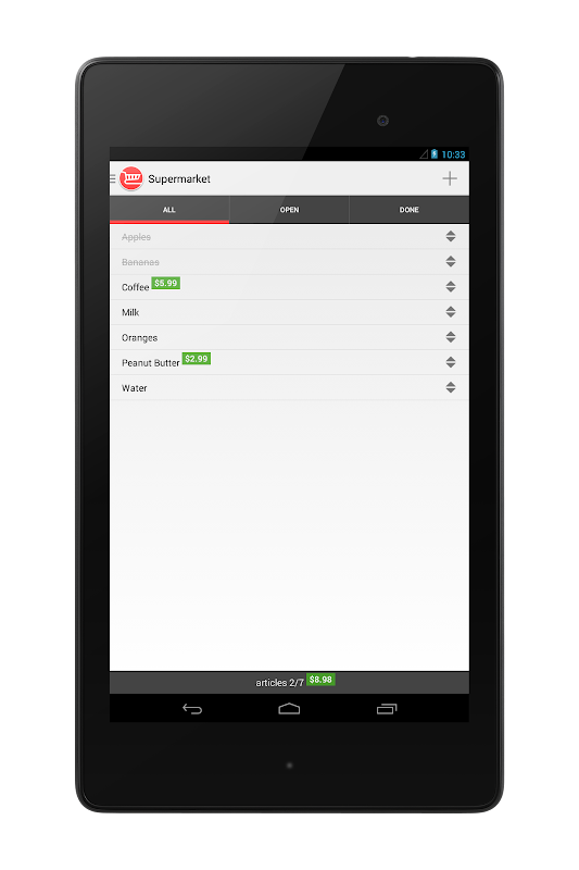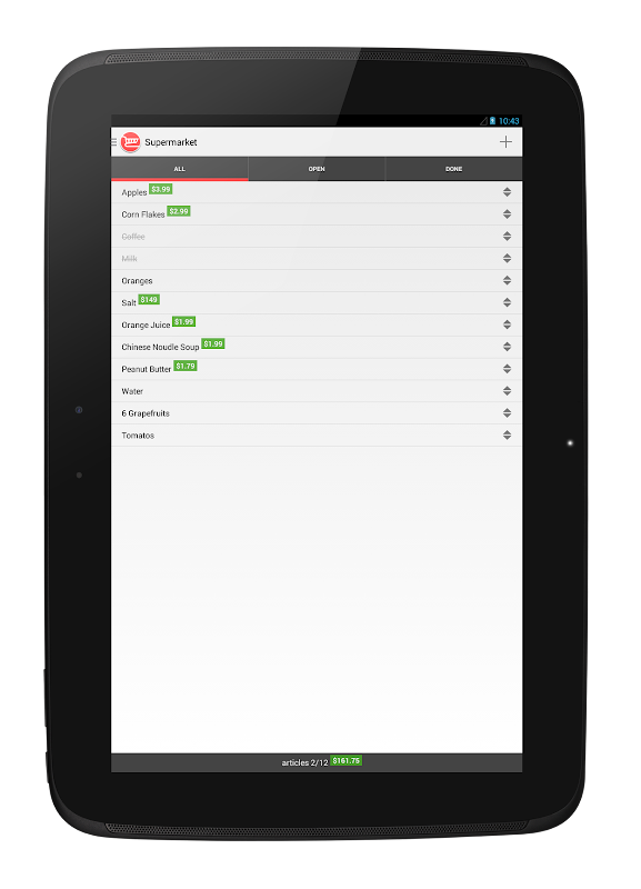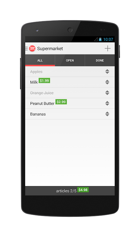 Chỉ cần gõ giá với tiền tệ trong bài viết của bạn (ví dụ "cà chua $ 1,99") và các ứng dụng sẽ xác định giá cả và cho bạn thấy tổng của tất cả các bài viết trên danh sách thực phẩm của bạn. Không có hộp thoại riêng biệt để chọn một loại tiền tệ và giá cả. Chỉ là cách bạn sẽ làm điều đó trên giấy, nhưng một chút thông minh hơn.