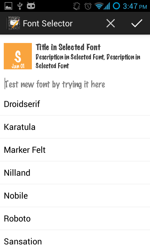 Simply Notes not only allows you to customize your background but your Font as well by selecting from a list of 15 fonts. Customize by using the Slide out menu on the left hand side.