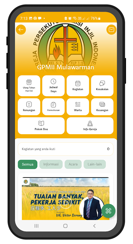 Ứng dụng GPMII Synod hiện diện như một phương tiện liên lạc và thông tin giữa các nhà thờ và hội thánh GPMII trên khắp Indonesia. Dưới đây là một số tính năng có sẵn: