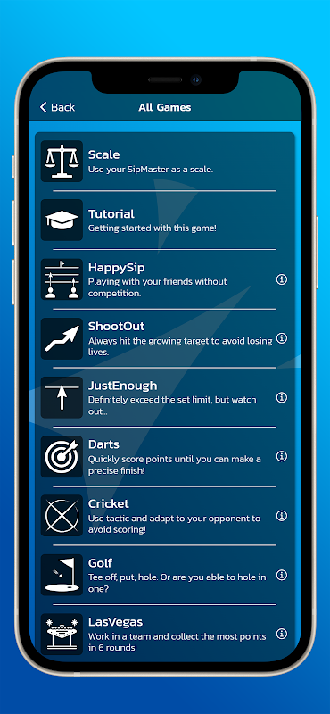 SipMaster là trò chơi uống rượu cấp độ tiếp theo dành cho tất cả các quán rượu và những người hâm mộ tiệc tùng tại gia. Trò chơi uống rượu, bao gồm một ứng dụng và phần cứng liên quan (hoặc cân nhà bếp), kết hợp giữa niềm vui và sự cạnh tranh trong một hình thức hoàn toàn mới! Đánh giá từng ngụm của bạn chính xác hơn bạn bè của bạn và trở thành một SipMaster! Các biến thể trò chơi khác nhau mang đến sự đa dạng và thú vị lâu dài.