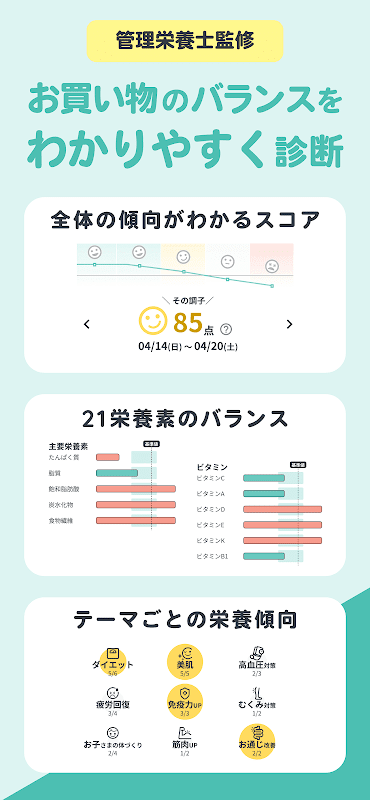 - Bạn có thể xem cân bằng dinh dưỡng khi mua sắm từ biểu đồ gồm 21 loại chất dinh dưỡng. Bạn có thể xem cân bằng dinh dưỡng trong ba tháng qua, vì vậy bạn có thể sử dụng nó như một nhật ký dinh dưỡng hàng ngày.