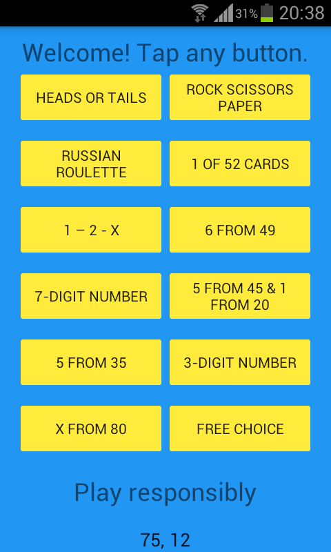 With SittingLuck you don't have to bother finding random numbers to use for your favorite game. Just tap a button and.... let your luck to chance.