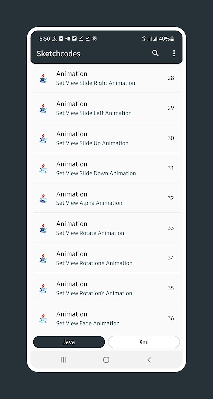 Ứng dụng này cung cấp một danh sách lớn các mã Java và Xml để tạo ứng dụng bằng Android Studio và Sketchware.