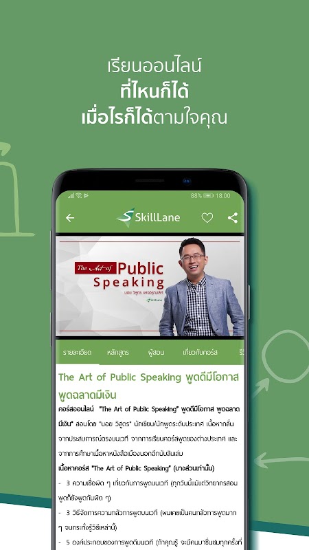 SkillLane là nền tảng khóa học trực tuyến lớn nhất và số 1 của Thái Lan. Chúng tôi cung cấp một nền tảng cho các chuyên gia thuộc bất kỳ ngành nghề nào để tạo ra các khóa học có thể cung cấp cho công chúng. Với hơn 3.000 khóa học trực tuyến về đầu tư chứng khoán, thiết kế, tiếp thị, máy tính, v.v., bất kỳ ai cũng có thể học mọi lúc, mọi nơi.