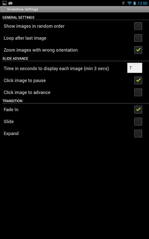 Choose from a number of different transition effects to use when your slideshow is running. You can also set the slide advance to manual and only move to the next image when you are ready. When using auto-advance you can click to pause the slideshow on the current image and click again when you want to resume.