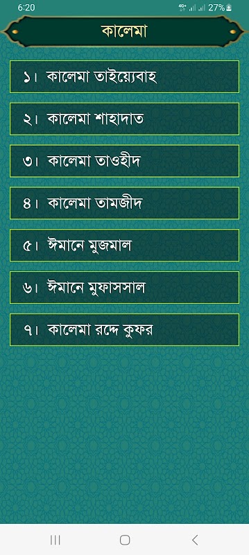 26 surah nhỏ với cách phát âm, ý nghĩa, tệp mp3 và tafsir của suras tiếng Bengal. Ngoài ra còn có 6 khana kalema, 6 Durood Sharif và 20 lời cầu nguyện d'ua đơn giản và ngắn gọn.