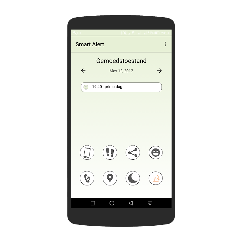 Smart Alert is de app die je helpt om op tijd op te merken dat het minder goed met je gaat (misschien een beginnende depressieve episode) of juist een beetje te goed met je gaat (misschien een beginnende manische episode).