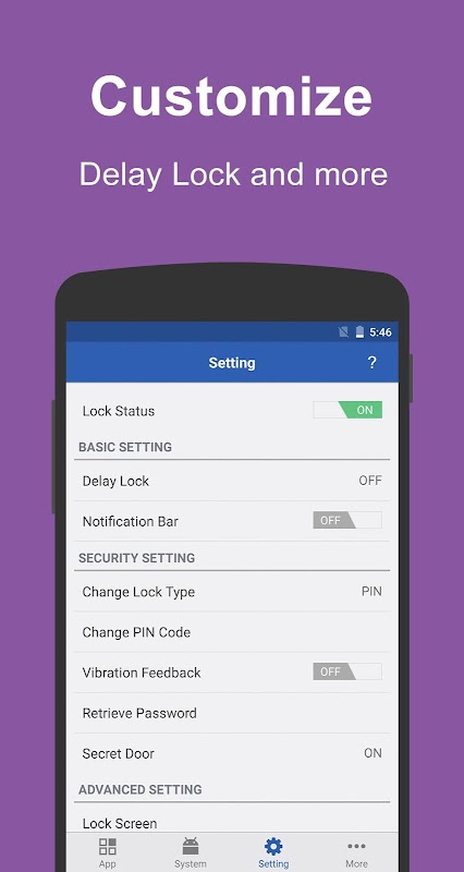 • Bảo vệ ứng dụng bằng nhiều kiểu khóa, như Khóa bằng Hình mẫu, khóa bằng mã PIN và Khóa bằng Mật khẩu