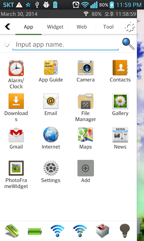 6. Useful tools (Memory clean, Battery usage, Wifi on/off, Select wifi, Data usage, Flash light)