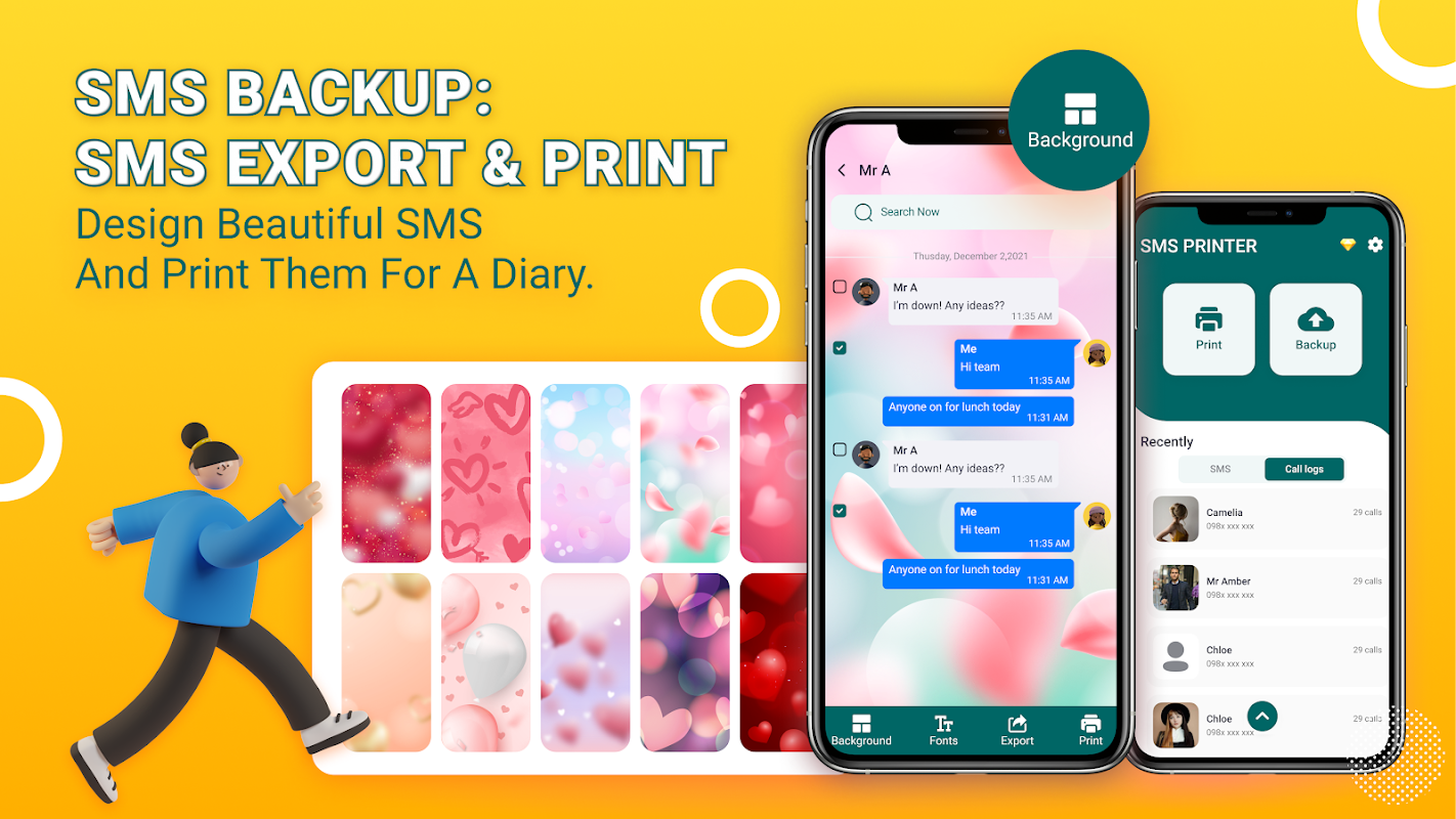 Máy in SMS: SMS Backup & SMS Export là một ứng dụng đơn giản có các chức năng đặc biệt như tạo các bản sao lưu của SMS và nhật ký cuộc gọi . Dễ dàng khôi phục SMS và khôi phục nhật ký cuộc gọi từ các tệp đã sao lưu hoặc in SMS chúng. Đặc biệt là chức năng SMS theme , giúp bạn lựa chọn những hình nền đẹp và độc đáo cho những cuộc trò chuyện của mình. Sau đó, bạn có thể xuất nhật ký cuộc gọi và SMS để chia sẻ với bạn bè và những người thân yêu của mình. Việc truyền tải nội dung cung cấp một cách nhanh chóng và dễ dàng để sao lưu tin nhắn SMS và nhật ký cuộc gọi.