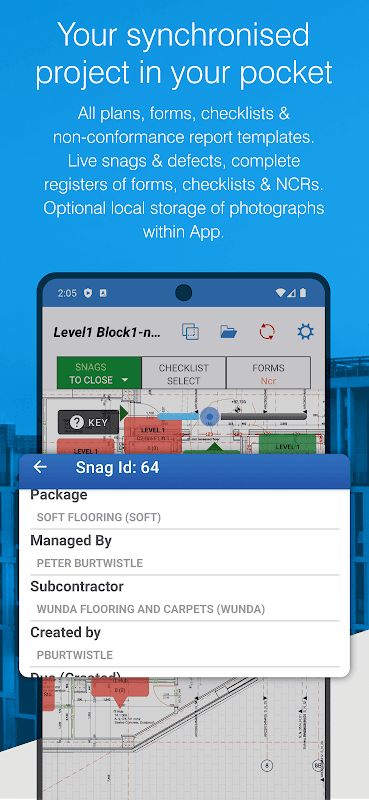 Snags có thể dễ dàng bước vào, cập nhật và đóng cửa qua App và người sử dụng có thể xác định và nhận xét về snags cộng upload nhiều ảnh từ máy ảnh hoặc bộ sưu tập và tạo ra bản phác thảo và kế hoạch mark-up.