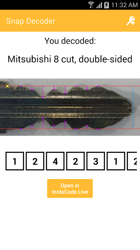 Sau đó, gửi bitting để InstaCode Live cho Android để chuyển đổi các bitting vào mã nguồn và cắt chìa khóa trong một flash (trên một trong những InstaCode Live cho Android hỗ trợ máy key).
