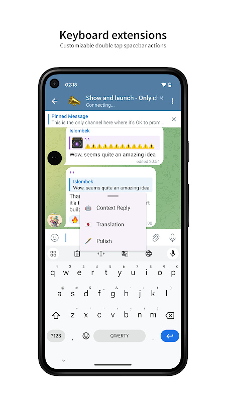 Bắt đầu từ v1.1.0, chúng tôi bắt đầu khám phá những tình huống thú vị mà AI có thể thực hiện trên Android. Hiện tại chúng tôi đã hỗ trợ dịch toàn màn hình và tiện ích mở rộng bàn phím, nhiều tính năng thú vị hơn đang được phát triển.