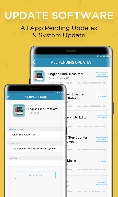 Cập nhật phần mềm: Cập nhật phần mềm cho Android Mobile với Cập nhật phần mềm ứng dụng và hệ thống là một ứng dụng phải có năng suất cho tất cả các thiết bị Android của bạn. Cập nhật phần mềm 2018 hoặc ứng dụng Cập nhật phần mềm cho phép bạn Cập nhật phần mềm như Cập nhật phần mềm hệ thống hoặc Cập nhật hệ điều hành, Cập nhật ứng dụng, Gỡ cài đặt ứng dụng và kiểm tra Bản cập nhật đang chờ xử lý.