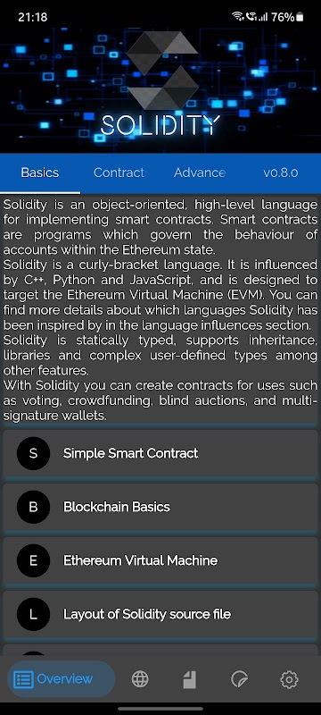Ứng dụng này dành cho tất cả những người đam mê tiền điện tử và lập trình viên. Mọi người đều có thể học bằng cách sử dụng ứng dụng này về cách viết mã hợp đồng thông minh bằng ngôn ngữ lập trình solidity.